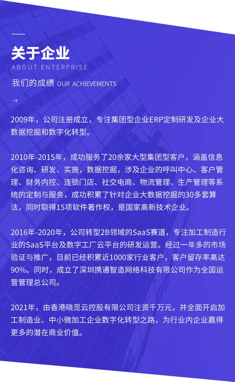 2016年-2020年,公司转型2B领域的SaaS赛道,专注加工制造行业的SaaS平台及数字工厂云平台的研发运营。经过一年多的市场验证与推广,目前已经积累近1000家行业客户,客户留存率高达90%。同时,成立了深圳携通智造网络科技有限公司作为全国运营管理总公司。